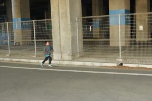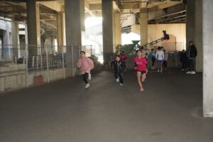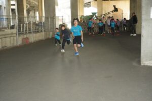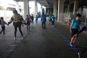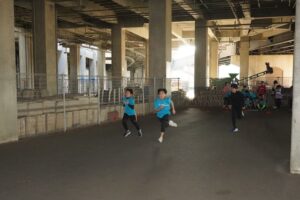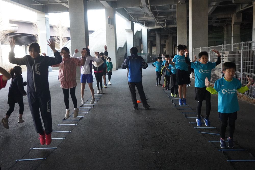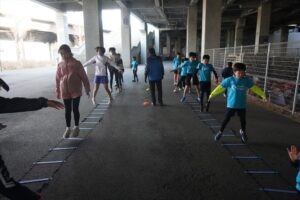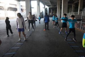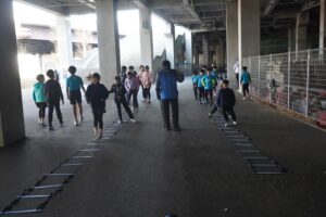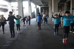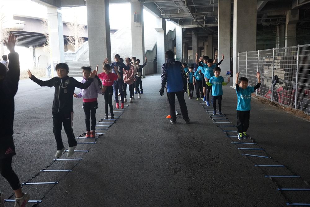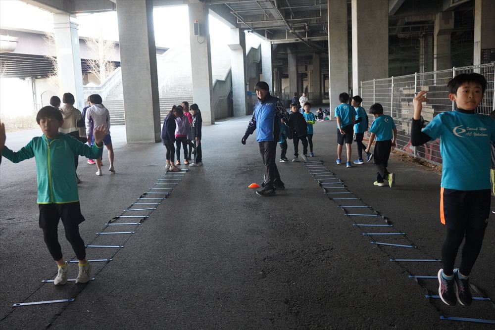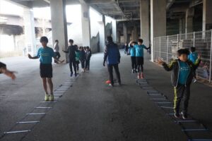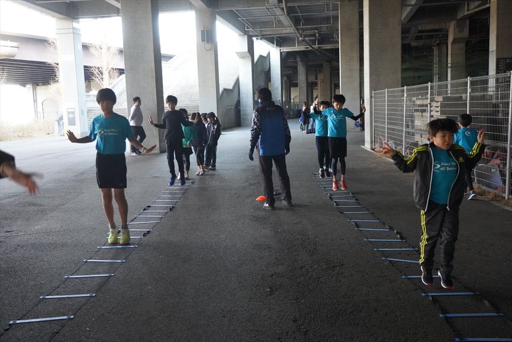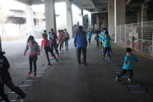 では、Jog・体操の後に、ラダードリルから。