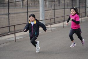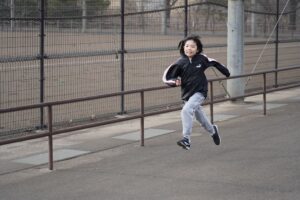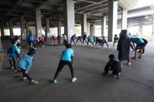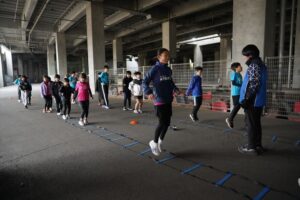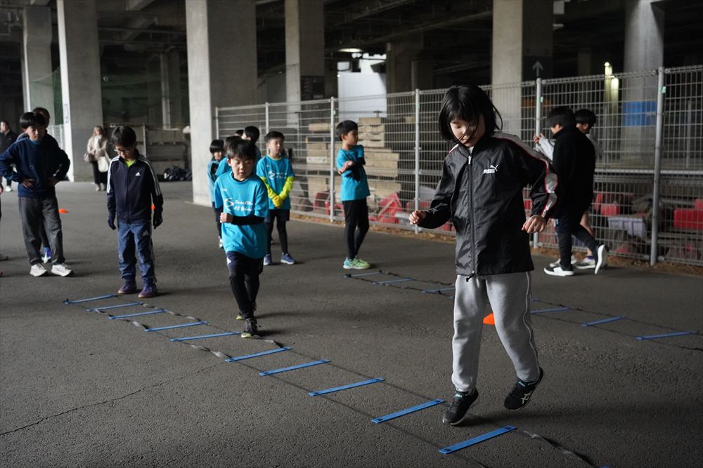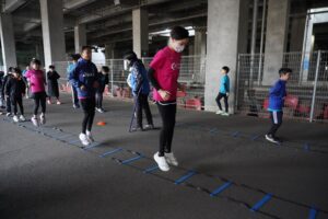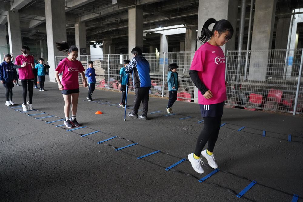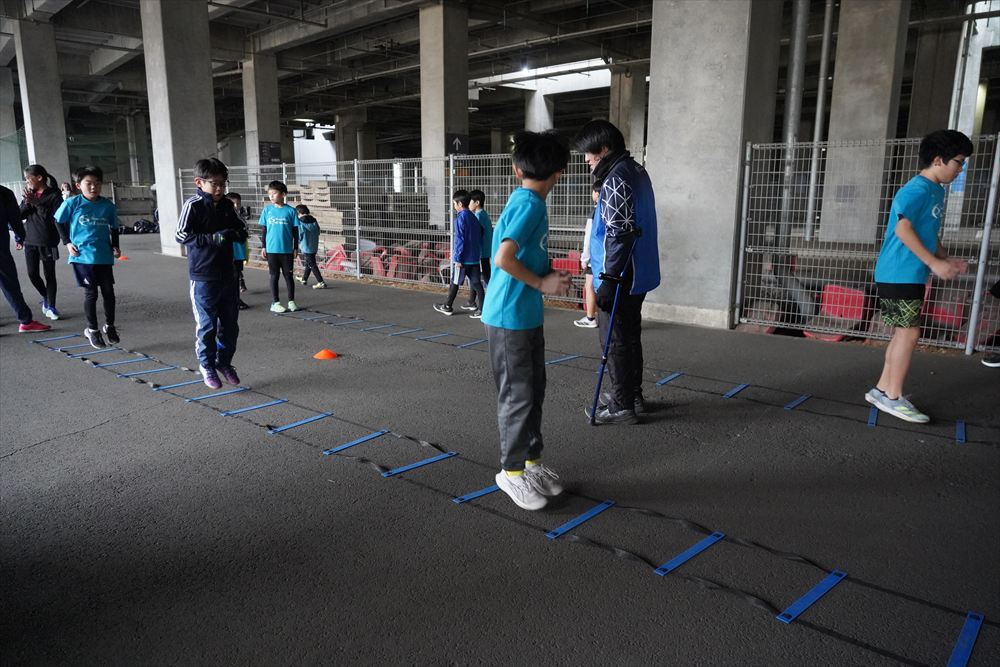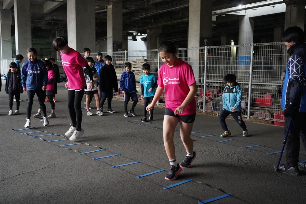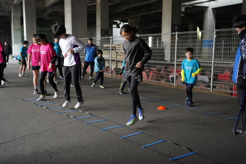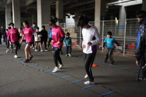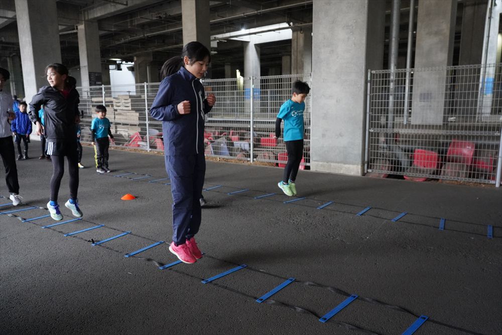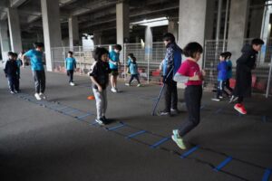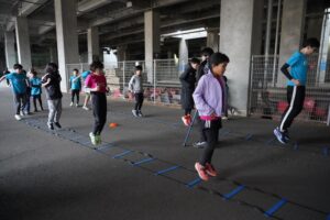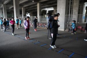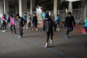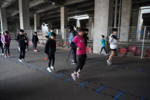 では、Jog・体操の後に、ラダードリルから。