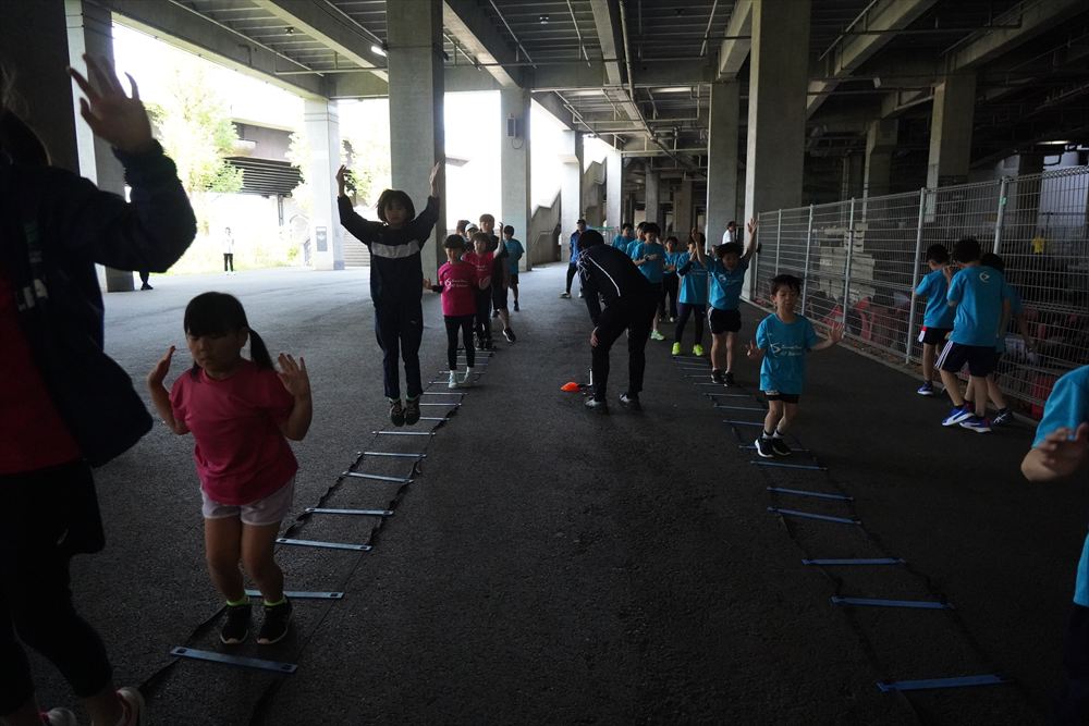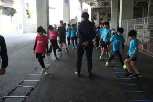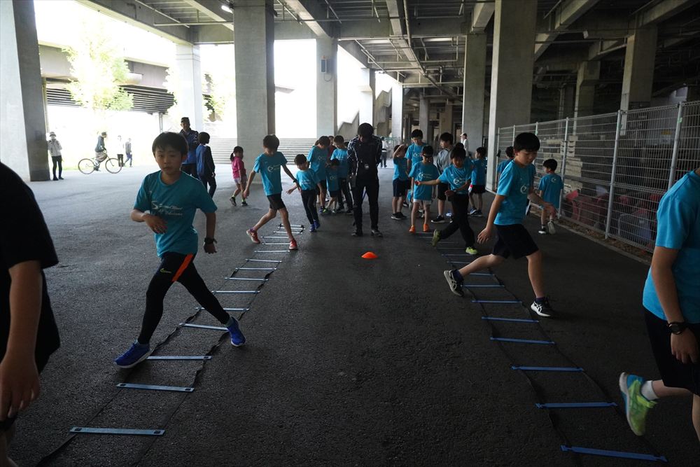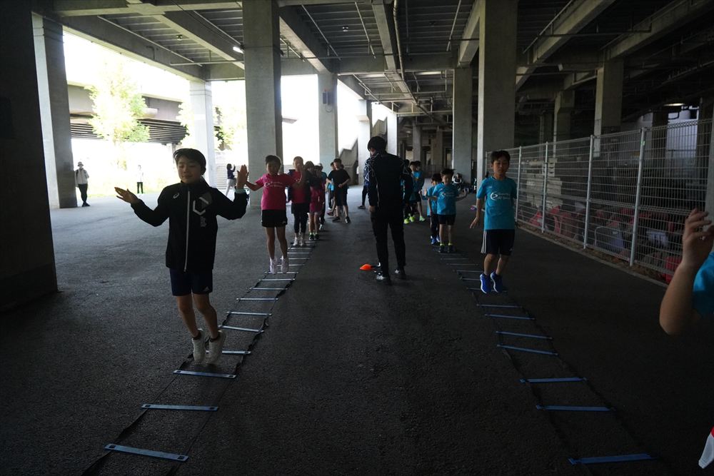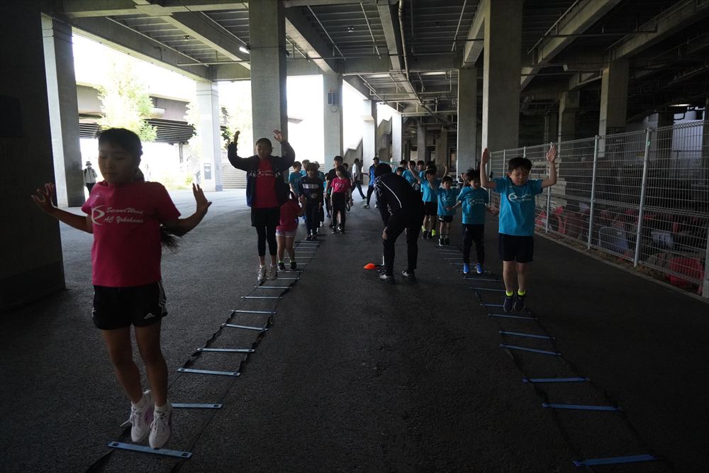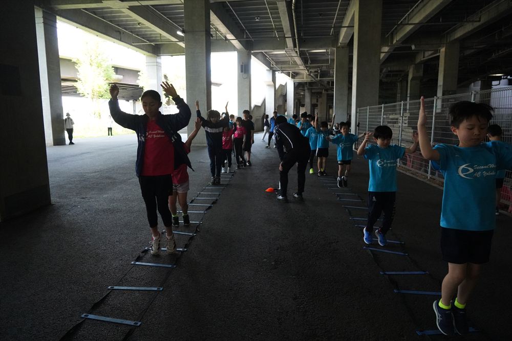 では、Jog・体操の後に、ラダードリルから。